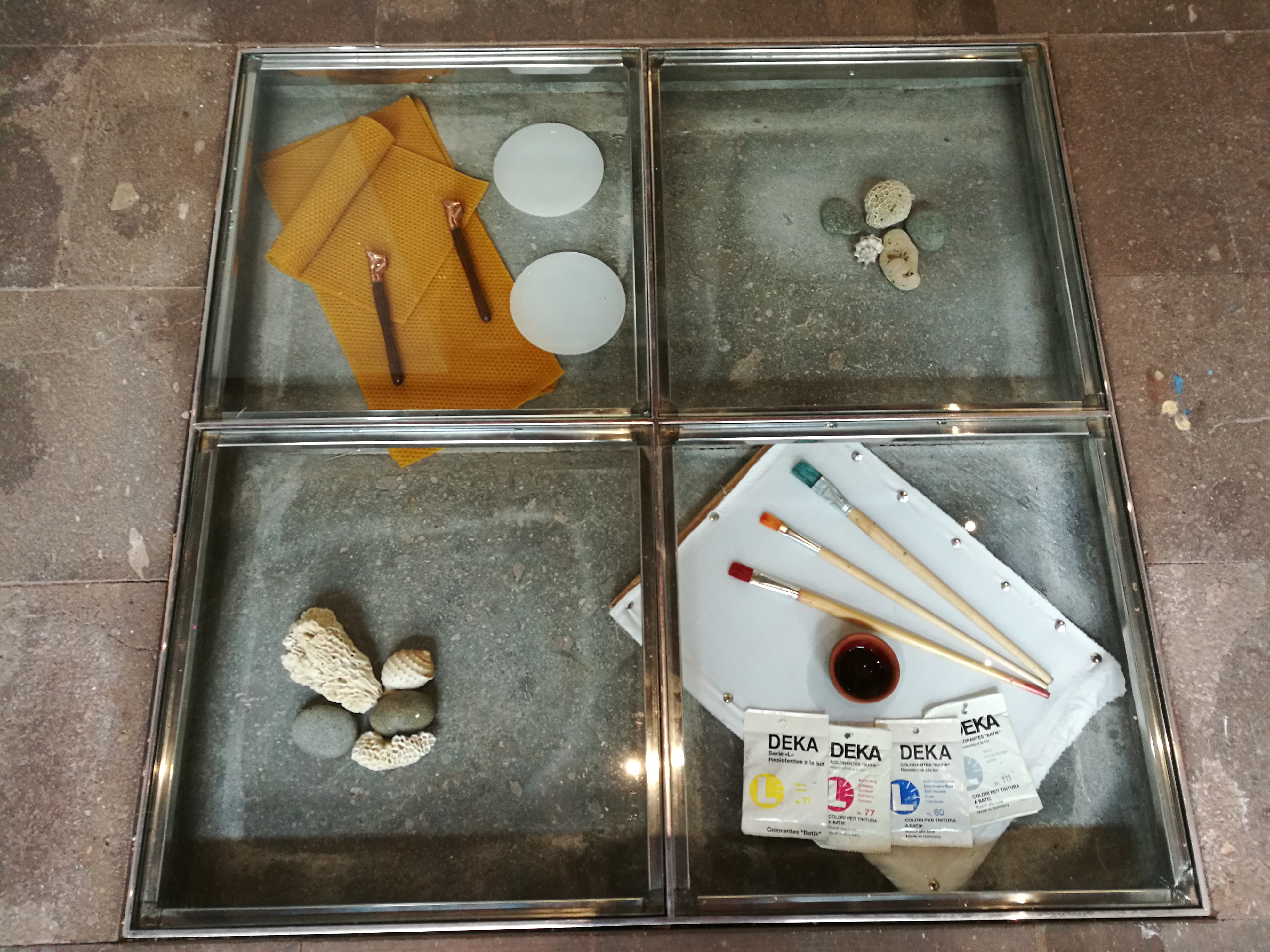 El artista consigue la cera de apicultores de Gran Canaria, que se la facilitan en bloques para hacer una mezcla de un 70 por ciento de este material y un 30 por ciento de parafina, aunque la cantidad varía según el clima y el efecto que Rafael López quiera conseguir, porque la parafina es más quebradiza mientras que la cera vuelve más blando el trabajo, y con eso juega.