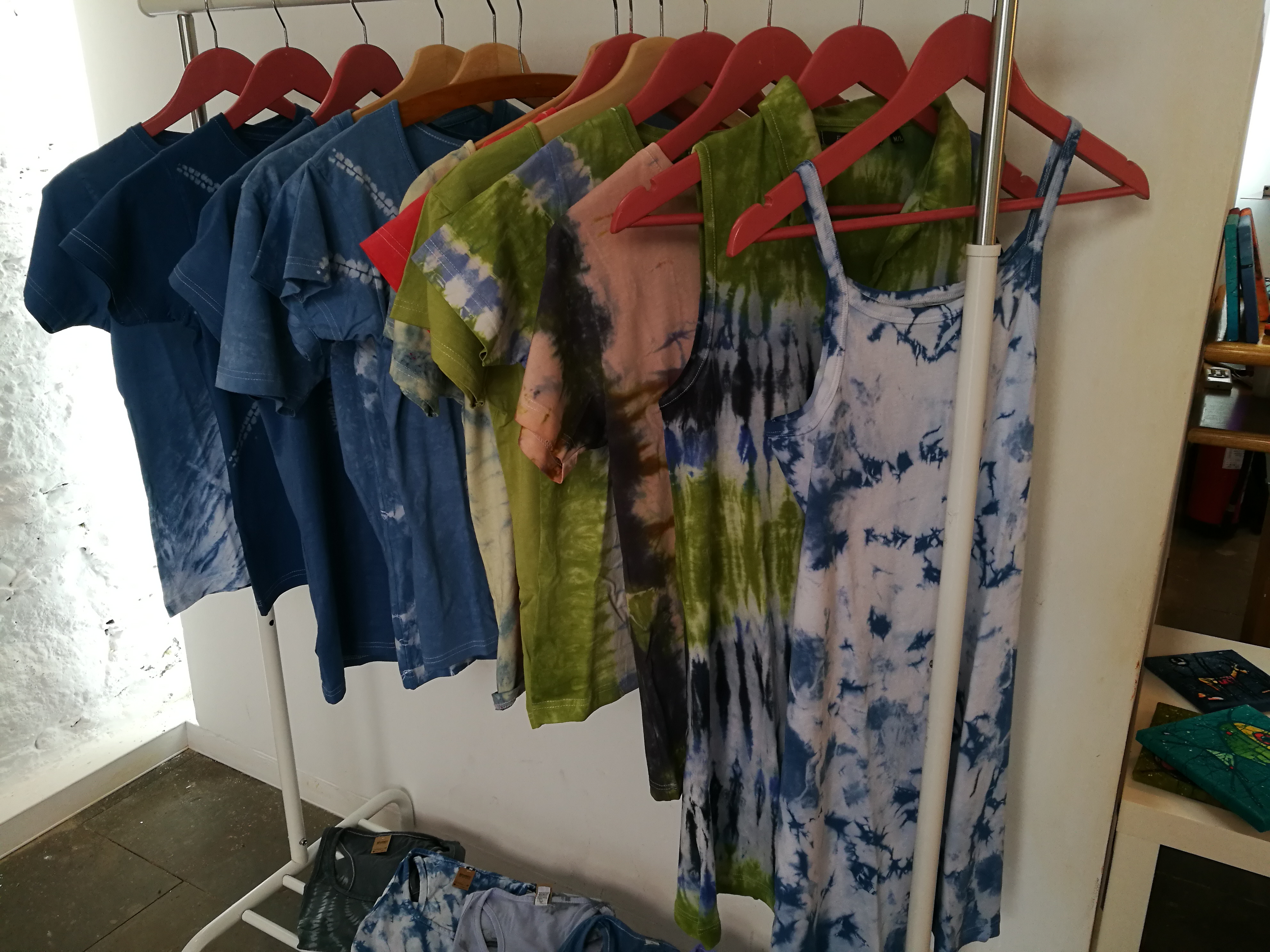 Para las prendas de vestir, López emplea también la técnica del shibori, una especie de batik por inversión que trabaja doblando, cosiendo o aplicando moldes sobre la tela para luego teñirla y, al desdoblarla, mostrar decorados originales y aleatorios.